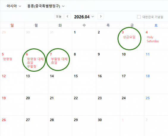 2026년 4월3일(금요일)-4월7일(화요일) 성금요, 청명절 대체휴일&부활절, 부활절 대체 휴일.